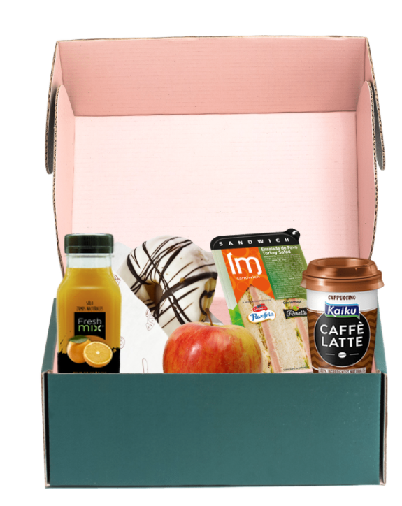 You will find: juice, coffee, bread, ham, pastries, apple, chocolate.